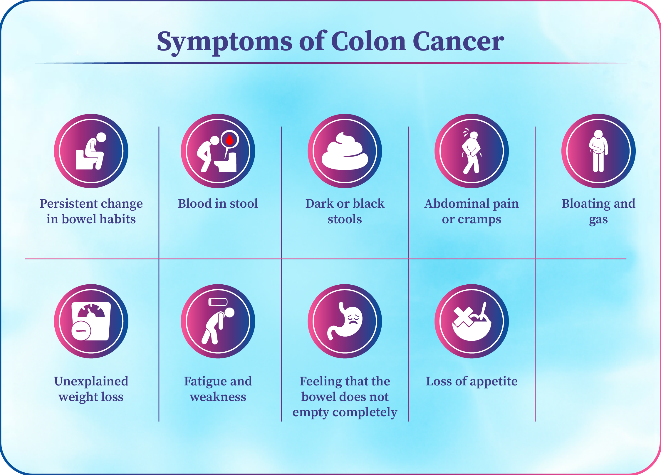 In early stages, colon cancer may not show any symptoms. As the disease progresses, common symptoms include: