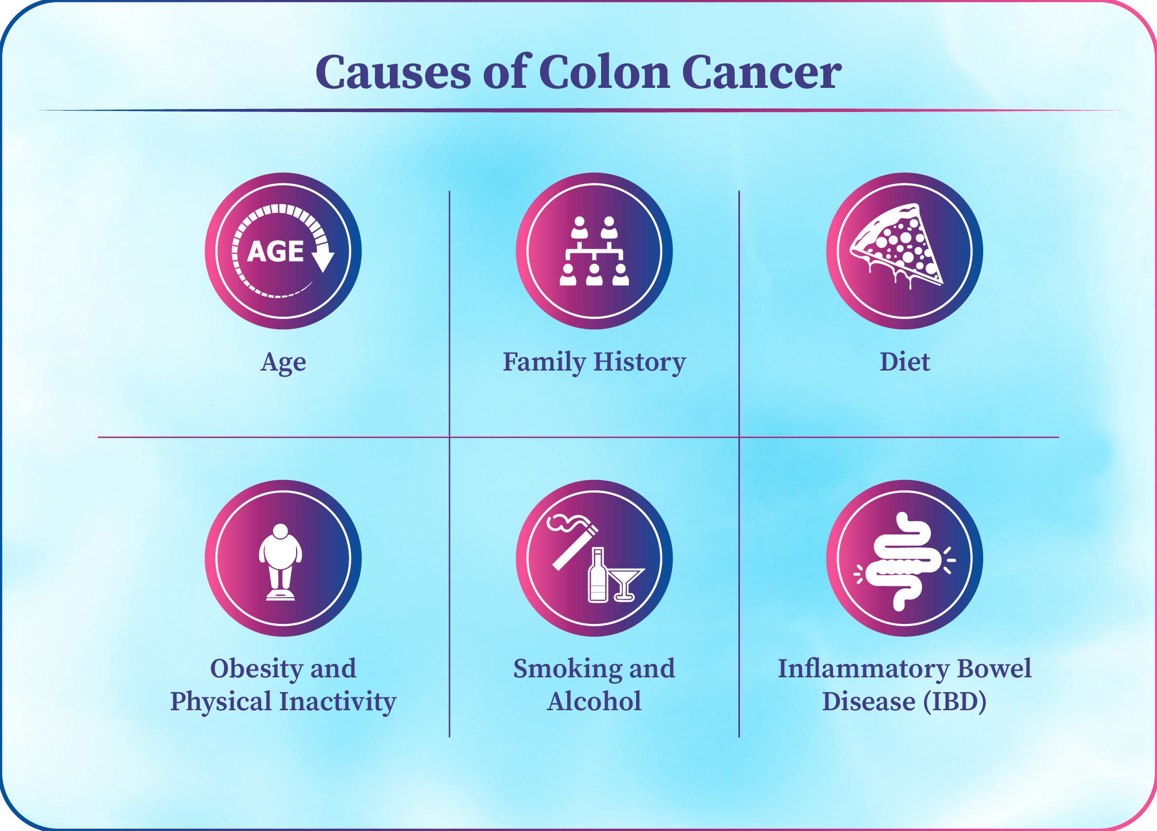 There is no single cause of colon cancer, but several risk factors increase the chances of developing it: