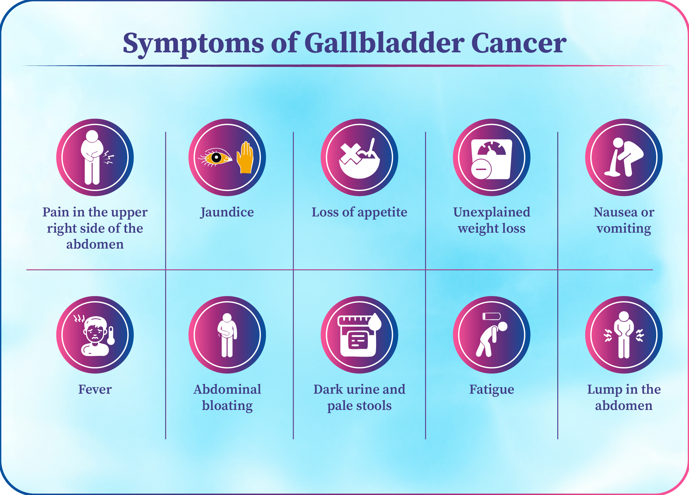 In the early stage, gallbladder cancer may not cause noticeable symptoms. As the disease progresses, symptoms may include: